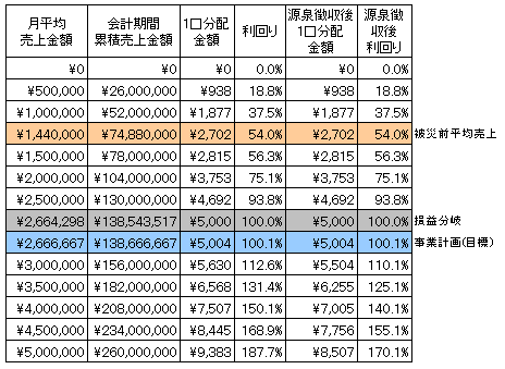 本匿名組合契約における分配金額のシミュレーションは以下のとおりです。なお、シミュレーションの目的は、本匿名組合事業の売上に応じた分配金額を予想することにあります。したがって、売上を保証するものではなく、匿名組合員に対し、分配金額を保証するものでもありません。