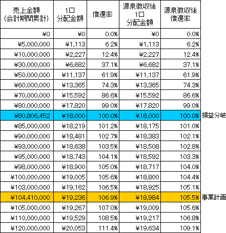 本匿名組合契約における金銭による分配金額のシミュレーションは以下のとおりです。なお、シミュレーションの目的は、本匿名組合事業の売上に応じた分配金額を予想することにあります。したがって、売上を保証するものではなく、匿名組合員に対し、分配金額を保証するものでもありません。