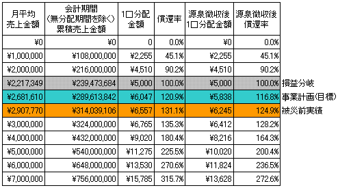 本匿名組合契約における分配金額のシミュレーションは以下のとおりです。なお、シミュレーションの目的は、本匿名組合事業の売上に応じた分配金額を予想することにあります。したがって、売上を保証するものではなく、匿名組合員に対し、分配金額を保証するものでもありません。