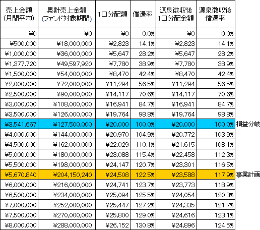 本匿名組合契約における金銭による分配金額のシミュレーションは以下のとおりです。なお、シミュレーションの目的は、本匿名組合事業の売上に応じた分配金額を予想することにあります。したがって、売上を保証するものではなく、匿名組合員に対し、分配金額を保証するものでもありません。