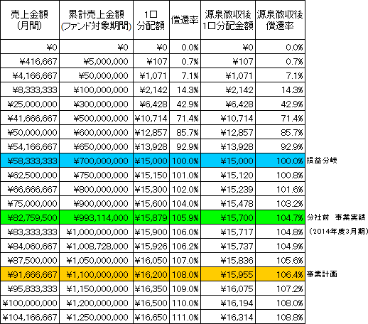 事業計画上の本匿名組合契約会計期間(1年間:2015年4月~2016年3月)の累計売上金額(税抜)は1,100,000千円であり、本匿名組合契約における累計リクープ売上金額(税抜)は700,000千円です。なお、営業者が分社独立する以前(2013年4月~2014年3月)の本匿名組事業の売上金額(税抜)は993,114千円です。