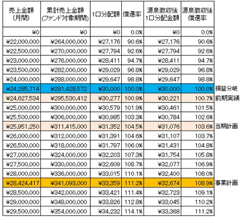 こちらは前期実績相当で売上が推移できれば、投資家の皆様には出資金元金分はお戻しすることができる損益分岐点の設定となっています。