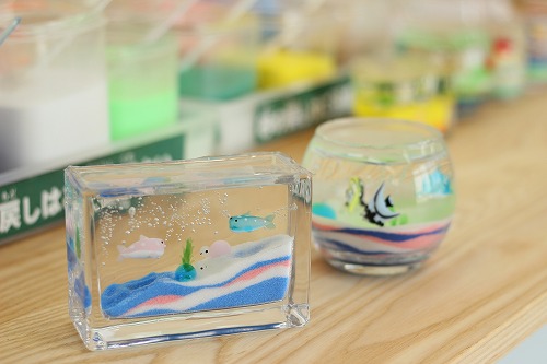 グラスの中にお好みの砂を入れ、かわいいガラス細工を並べて、