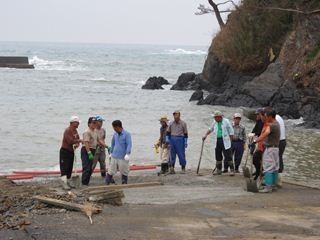 これまでも漁師さん達は、漁協の管理下のもと、共同で漁場の清掃作業を行ってきました。9月に入りますと例年であればワカメ養殖の準備がスタートするのですが、3月の津波で大小合わせておよそ100隻あった船のうち、無傷だったのは3隻。あとは津波にさらわれてどこに行ったか皆目判らないものもあれば、小船に船外機がついたくらいのものは、多くは港の中に沈みました。ごくごく簡単な造りの船は、船体に傷がついていなければ、船外機を取り替えれば使えますから、極力、海から引き上げてなんとか使える船を増やしていきました。