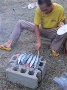 写真は2011年9月のもの。アウトドア好きでテントで過ごすボランティアの方に歌津の漁師さんたちがサンマを差し入れたときのものです。こうやってワイルドに焼いて食べるのもオイシイです。 馬場中山地区HP20110918