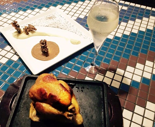 フランス産の丸鶏をオーブンでじっくりと焼き、舞茸と ジャガイモのソースをかけたものになります。 ご予約限定で1匹分2600円です。