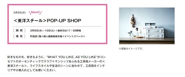 Hi, this is TOYO STEEL Press. Odakyu-dept Machida Store has “TOYO STEEL POP UP STORE” from 3/9/2022-3/15/2022. Please visit if you are around Tokyo!